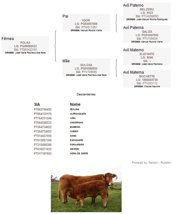 No caso das fêmeas é ainda possível observar a listagem de toda a sua descendência, possibilitando igualmente a consulta de genealogia de cada um destes animais, bastando